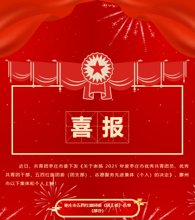 喜報 近日,共青團棗莊市委下發(fā)《關(guān)于表揚 2021 年度棗莊市優(yōu)秀共青團員、優(yōu)秀共青團干部、五四紅旗團委(團支部)、志愿服務(wù)先進集體(個人)的決定》,滕州市以下集體和個人上榜!棗莊市五四紅旗團委(團工委)名單(部分)棗莊市五四紅旗團支部(團總支)名單(部分)棗莊市優(yōu)秀共青團員名單(