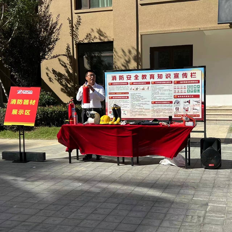 消防器材的講解及實操階段,翔宇物業滕北區域經理關繼革講解各類消防器材及使用方法,就如何使用消防器材進行現場示范。